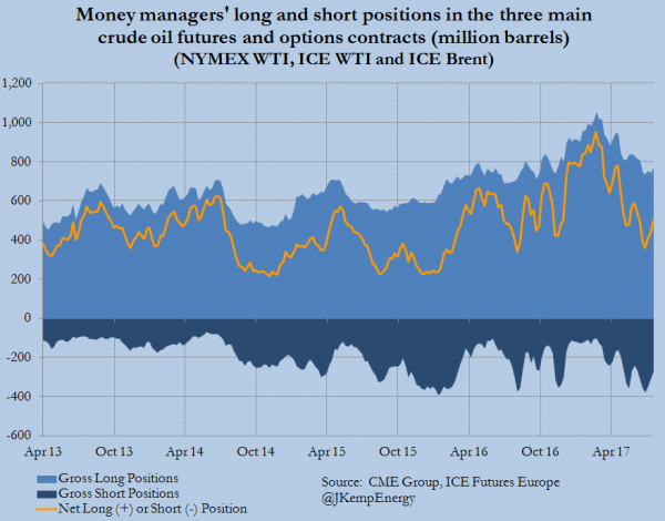 Hedge funds raised their combined net long position in Brent and WTI by 66 million barrels to 500 million barrels in the week to July 18.