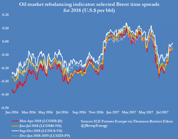 Conviction about market rebalancing is showing in a big rise in the calendar spreads for West Texas Intermediate (WTI) and especially Brent crude in the last two months.